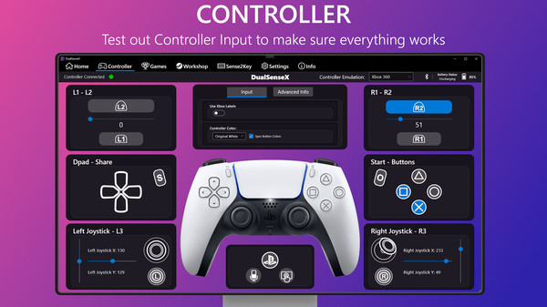 Information About the Game: Bring your DualSense Controller to life! Use 20 different Adaptive Trigger modes, enable Haptic Feedback(USB), Emulate Xbox 360 or DualShock 4 through USB or Bluetooth on PC.